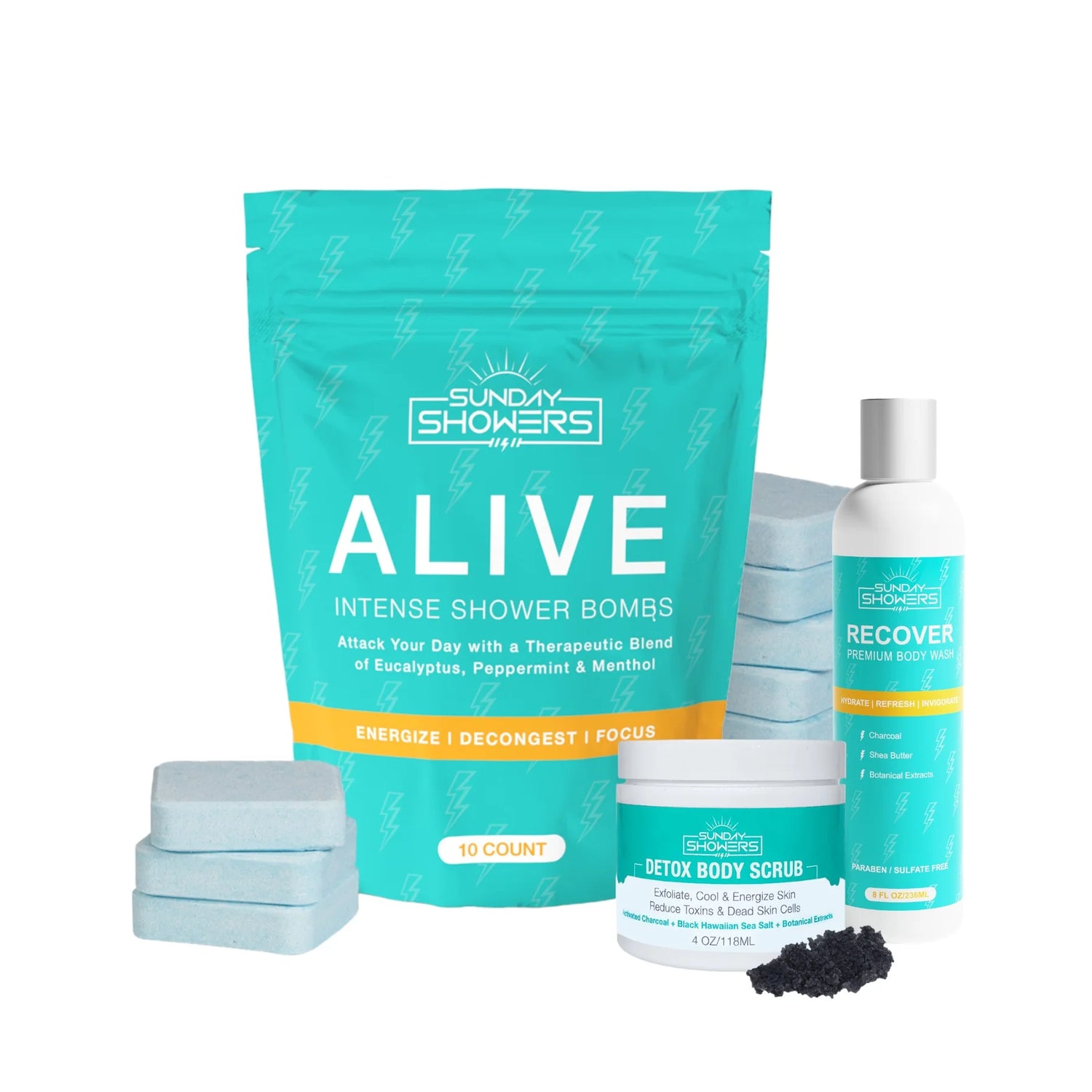 Energize your days effortlessly with our shower bombs, recovery wash, and detox scrub. All small batched in the USA.